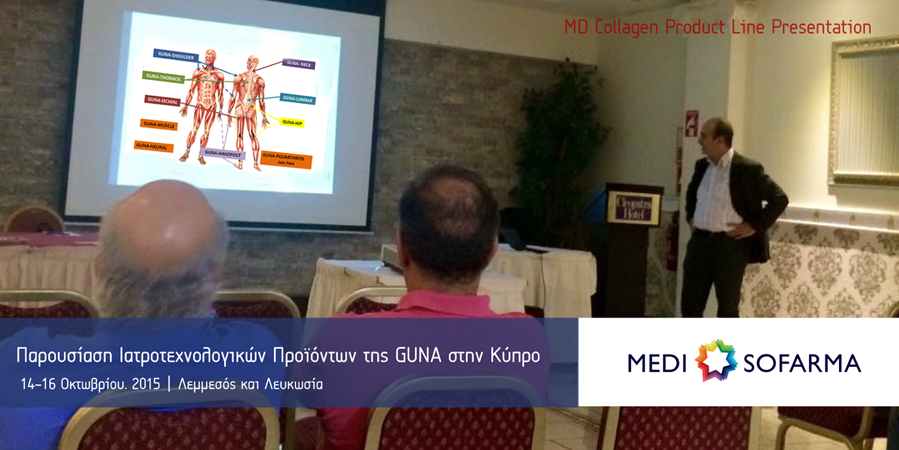 Την Παρασκευή, 16 Οκτωβρίου ολοκληρώθηκε η παρουσίαση των Ιατροτεχνολογικών προϊόντων MD Collagen της GUNA S.A. σε επαγγελματίες ορθοπεδικούς και φυσιάτρους στην Λευκωσία. Η ημερίδα οργανώθηκε με την υποστήριξη της STAR MEDICINE L.T.D., αποκλειστικό διανομέα των προϊόντων της Medisofarma για την Κύπρο.